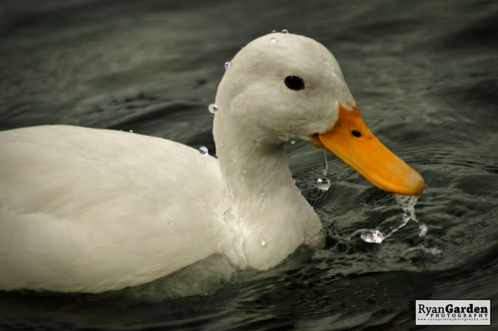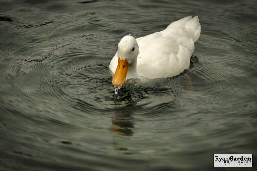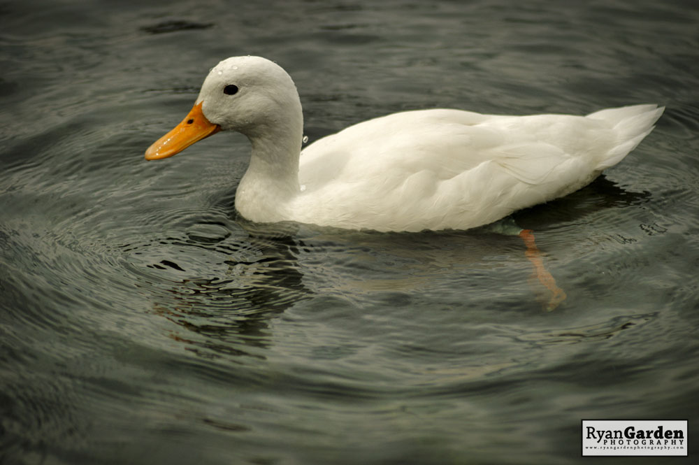 I believe this white duck to be a White Perkin, which is a breed of domestic duck. If they are domesticated then no one told this duck, as he may be a long way from home. He seemed to be the only duck of his breed on the lake, surround by mostly Mallards, Swans, and Geese. His white plumage definitely made him stand out against the Mallards, but was almost like he was trying to blend in with the resident swans.