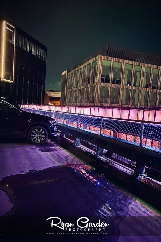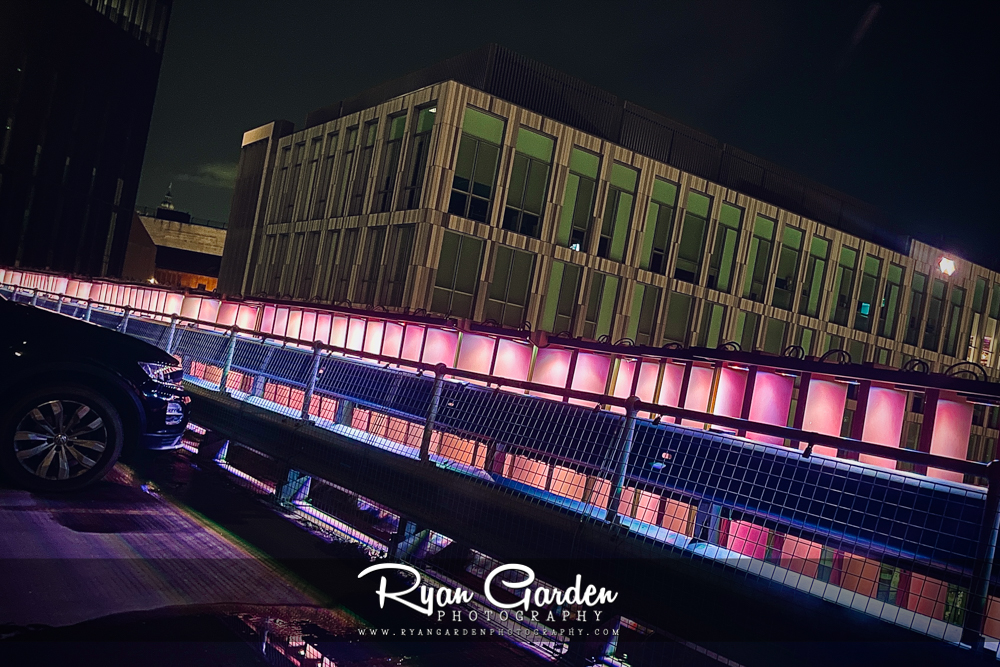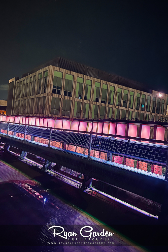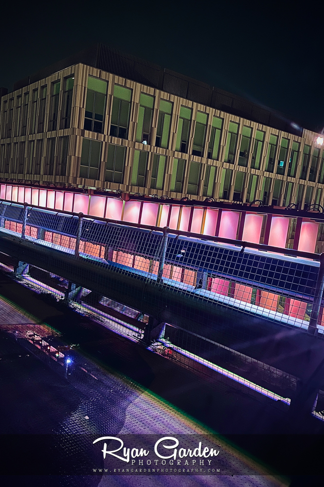 I was drawn to the glow in the darkness of the night. Gradients of pink and violet, like a pulse running through the steel and glass. The lights creating an almost cinematic scene.